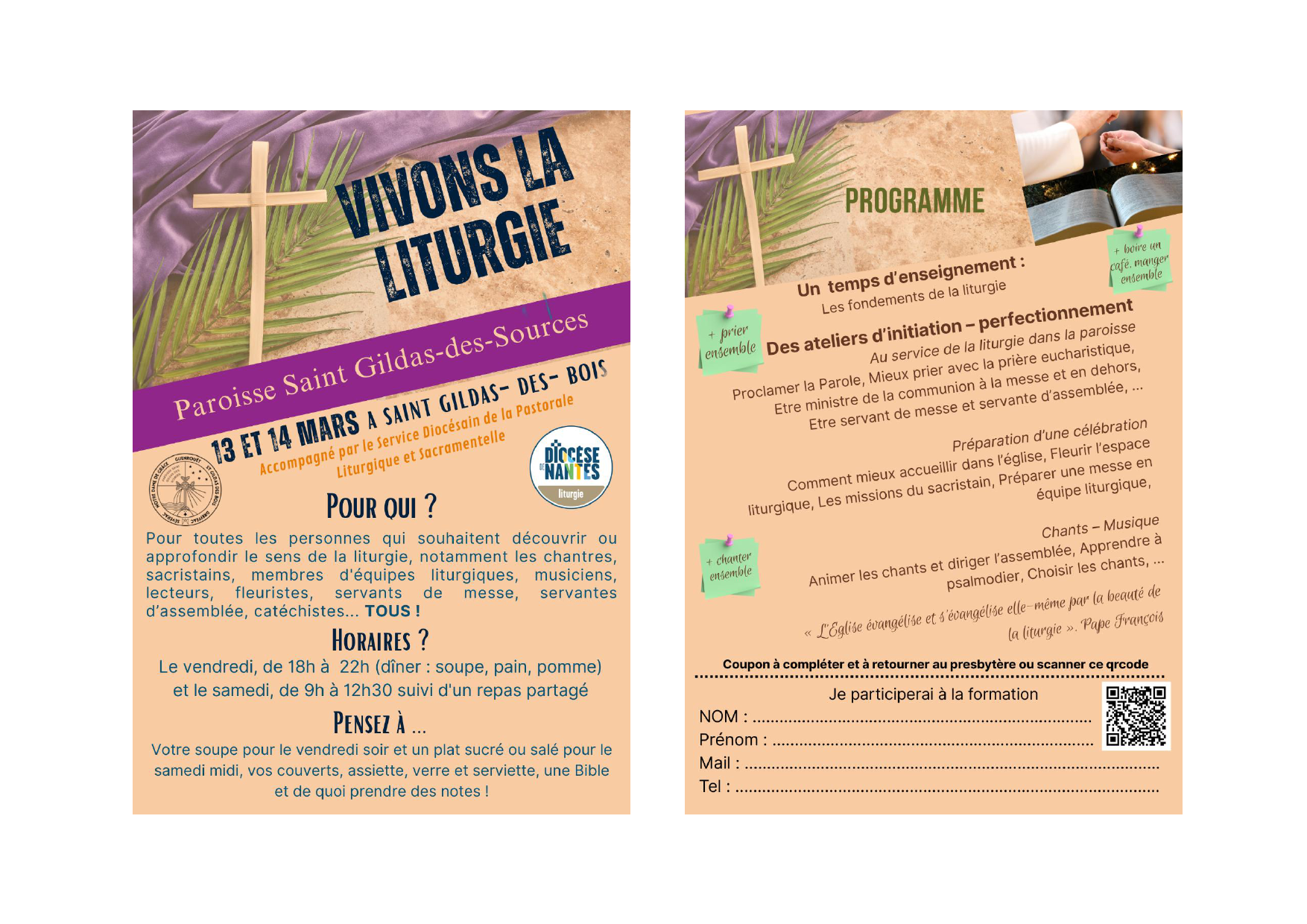 Programme de la formation Vivons la liturgie, les 13 et 14 mars